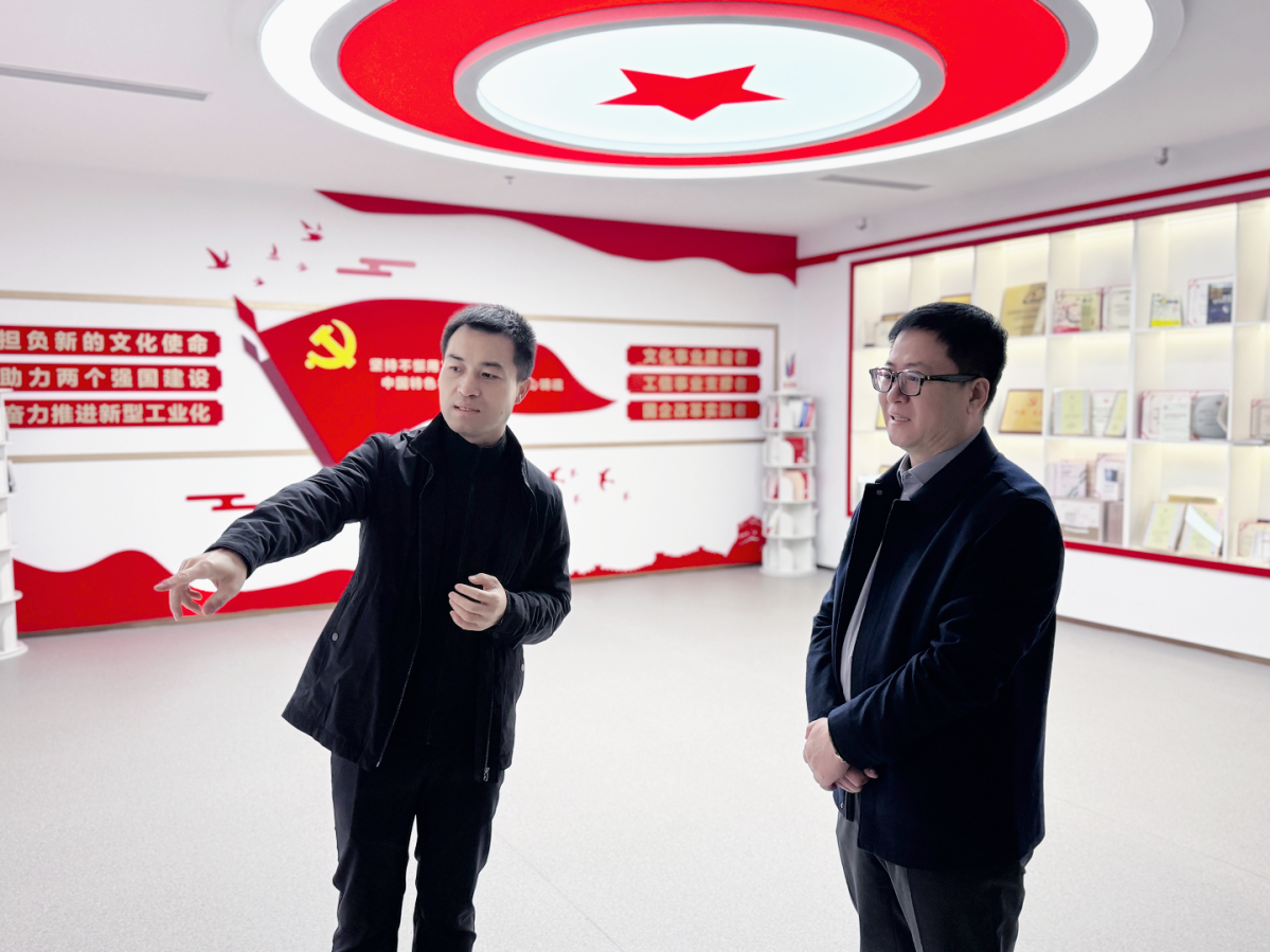 北京信通传媒有限责任公司党支部副书记兼副总经理付方明(左)带领山东省政协委员、农工党中央乡村振兴委委员、全国工商联教育商会副会长,山东省人民政府特邀教育督导、明日之星教育基金会发起人张明勇(右)参观公司展厅